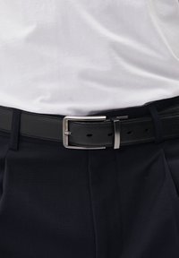 Črn usnjen pas z pravokotno kovinsko sponko, gladke teksture in nastavljive dolžine, z klasičnim, minimalističnim oblikovanjem.