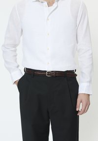 Bela lanena srajca z dolgimi rokavi in zlatimi gumbi, združena s črnimi hlačami in rjavim tkanim usnjenim pasom s srebrno sponko.