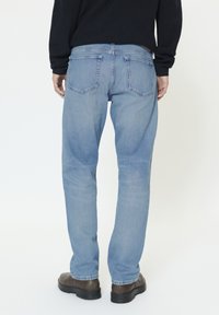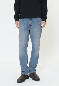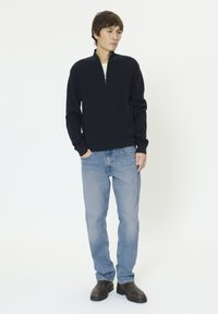 Moški, oblečen v svetlo modre kavbojke z ravnimi hlačnicami, črni pulover in temno rjavi usnjeni škornji, stoji na enobarvnem ozadju.