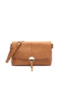 Bež pravokotna torbica čez telo z nastavljivim trakom, zapiranjem na poklopcu, srebrnim obročem in sprednjo pleteno cofaste detajlom.