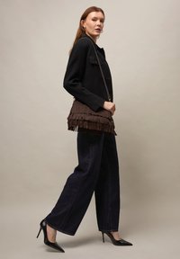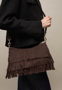 Oseba v črni jakni drži rjavo semiš torbo z resicami in zlatimi okraski, na bež ozadju.