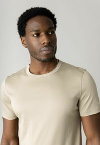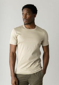 Moški s kratkimi kodrastimi lasmi, oblečen v bež kratko rokavno majico in olivne hlače, gleda v stran z eno roko v žepu.
