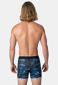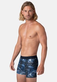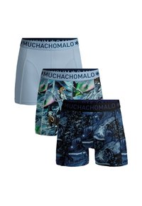 Moške bokserice z modrim vzorcem, ki vključuje valove in živali. Elastičen pas z blagovno znamko "MUCHACHO MALLO".