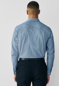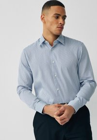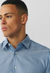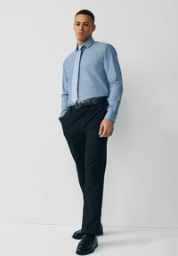 Mladi moški, oblečen v svetlo modro srajco, ujemajoč kravato, črne hlače in črne uradne čevlje, stoji z eno roko v žepu ob beli steni.