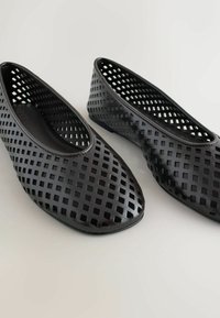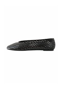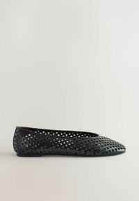 Črni ravni čevelj z odprtim rešetkastim vzorcem, zaobljenim prstom in prožnim materialom. Ima nizek peto in enakomerno gladko teksturo.
