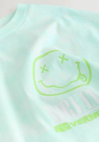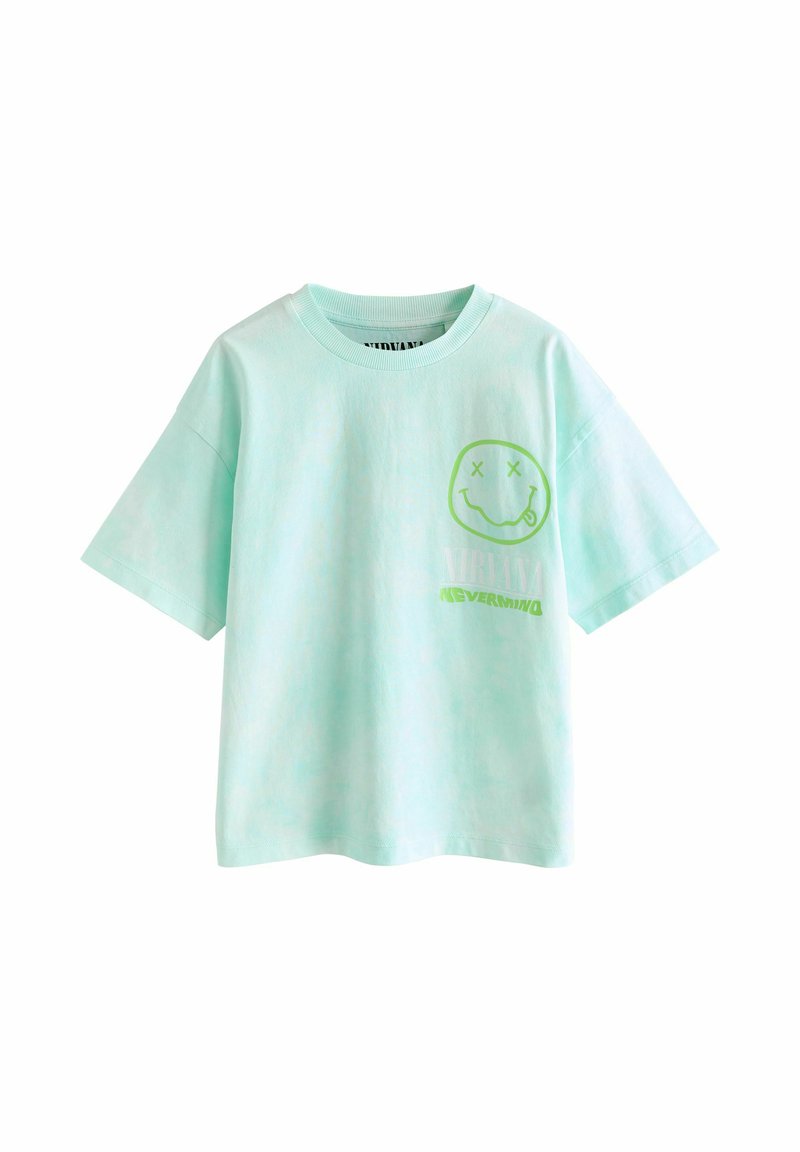 Mintasto zelena kratka majica s kratkimi rokavi in okrolim izrezom, z zelenim grafikonom nasmejanega obraza in napisom "NIRVANA NEVERMIND" na prsih.