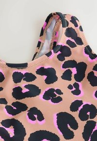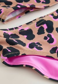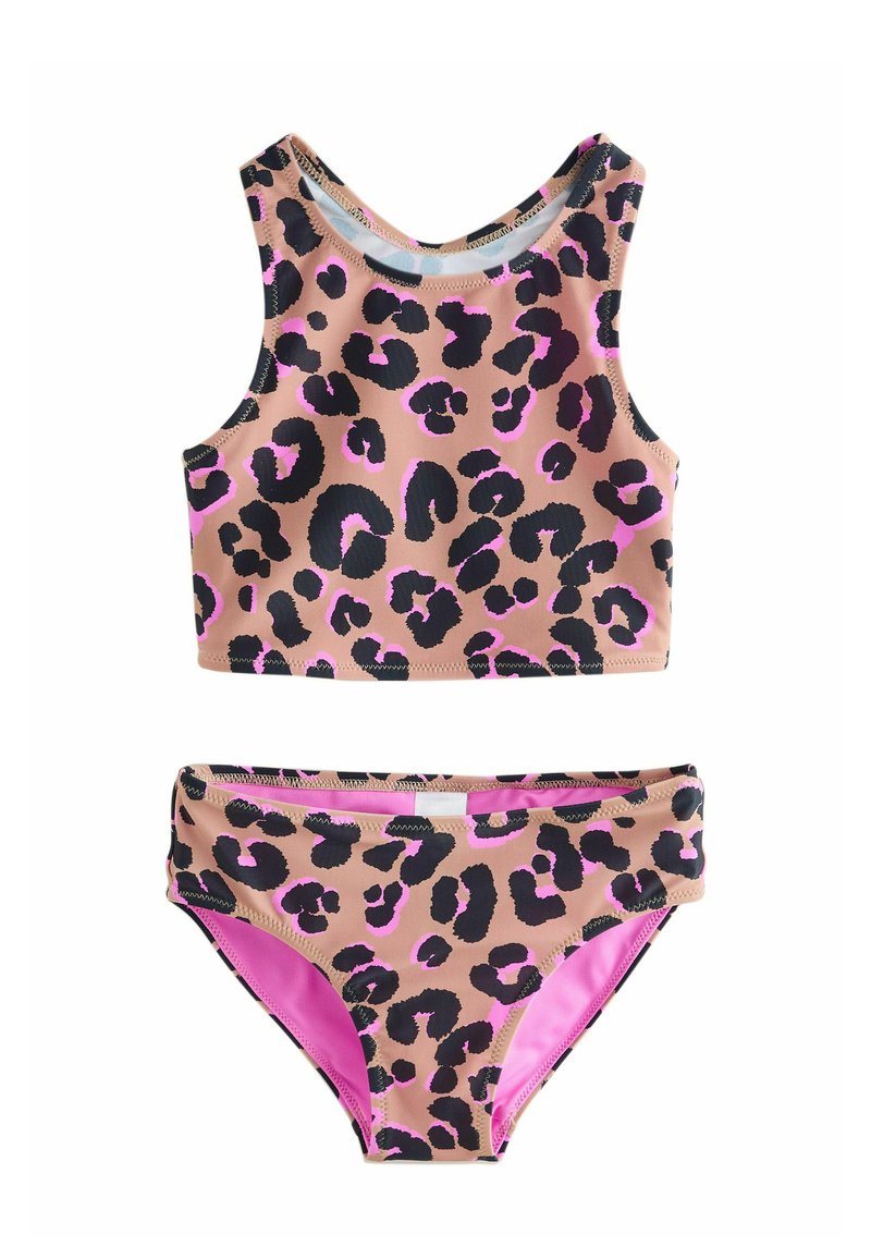 Dvodelne kopalke z leopardjim vzorcem v črni in roza barvi na bež podlagi, sestavljene iz brezrokavnega kratkega topa in ujemajočih bikini hlačk.