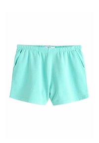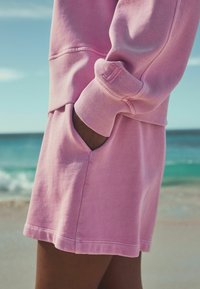 Ženska, oblečena v roza dolg rokav in kratke hlače, stoji na peščeni plaži z oceanom in jasnim nebom v ozadju.