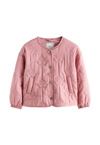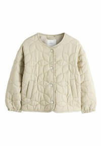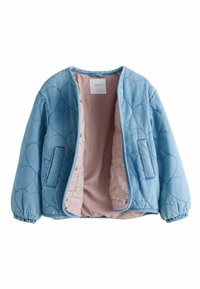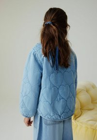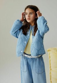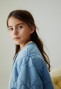 Dekle z dolgimi lasmi nosi modro prešito jakno s potiskom srčkov, široke jeans hlače in srebrne balerinke, stoji pred rumenim oblazinjenim stolom.