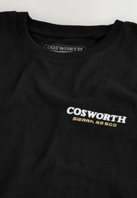 Črna kratka majica s kratkimi rokavi z belim in rumenim napisom "COSWORTH SIERRA RS 500" na levi strani prsi.