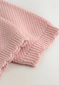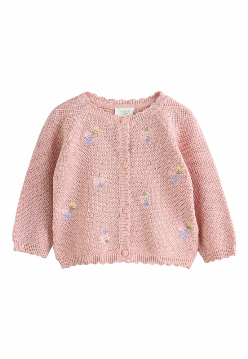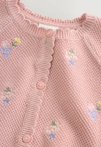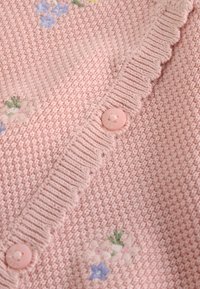 Svetlo rožnat pleteni cardigan z valovitim ovratnikom, teksturirano tkanino in cvetlično vezenino v rumeni in modri barvi, s petimi gumbi na sprednji strani.