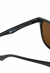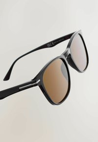 Sončna očala s črnimi okvirji, pravokotnimi rjavimi lečami in rahlo ukrivljenimi ročaji na belem ozadju.