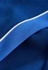 Modre trenirke iz mehkega blaga z belimi stranskimi črtami, elastičnim pasom z zategovalno vrvico in dvema stranskima žepoma.