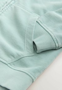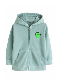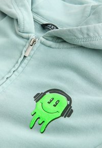 Zelena svetlo modra majica s kapuco z zadrgo, sprednjimi žepekoma in majhnim zelenim motivom talilnega obraza s slušalkami na prsih.