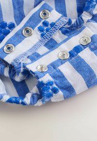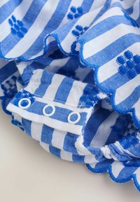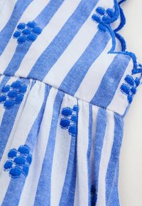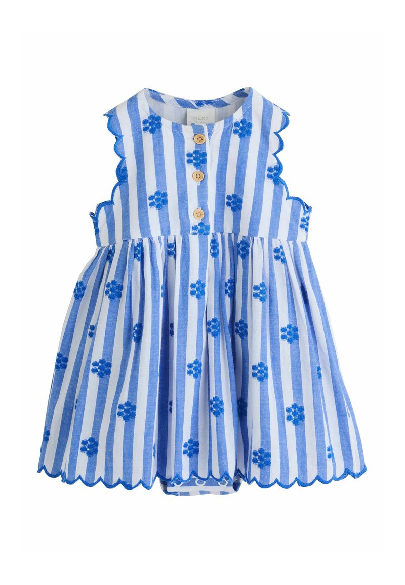 Modra in bela otroška obleka s črtami, valovitim robom, vezenimi modrimi cvetovi in tremi lesenimi gumbi spredaj.