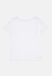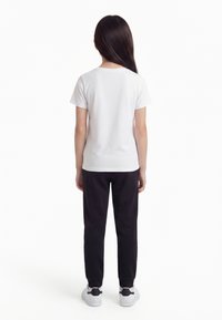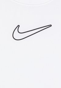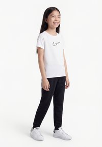 Nasmejana deklica stoji oblečena v belo majico Nike, črne hlače in bele superge na enobarvnem belem ozadju.