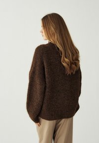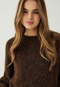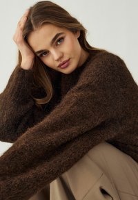 Mlada ženska z dolgimi valovitimi lasmi, oblečena v temno rjavi mehki pleteni pulover in bež hlače, gleda v stran na enobarvnem ozadju.