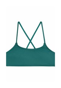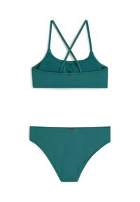 Tirkizno modrček bikink z obliko prekrižanih naramnic in nastavljivimi trakovi, s pripadajočimi boki v hipsterskem slogu. Gladek, raztegljiv material.