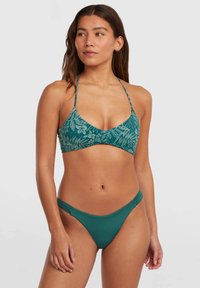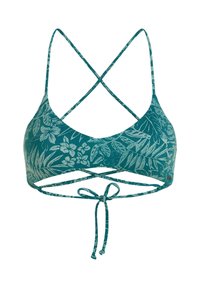 Zelena zgornji del bikinija s cvetličnim vzorcem, s tankimi nastavljivimi naramnicami in trikotno obliko košaric. Gladek tekstilen material.