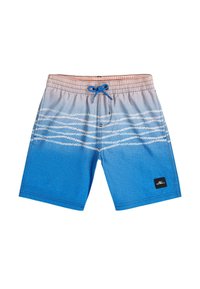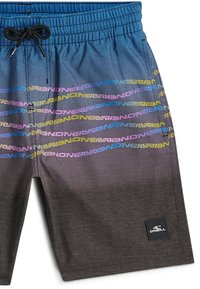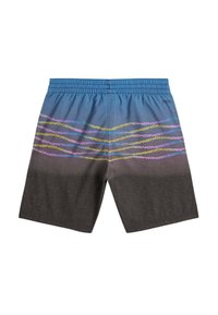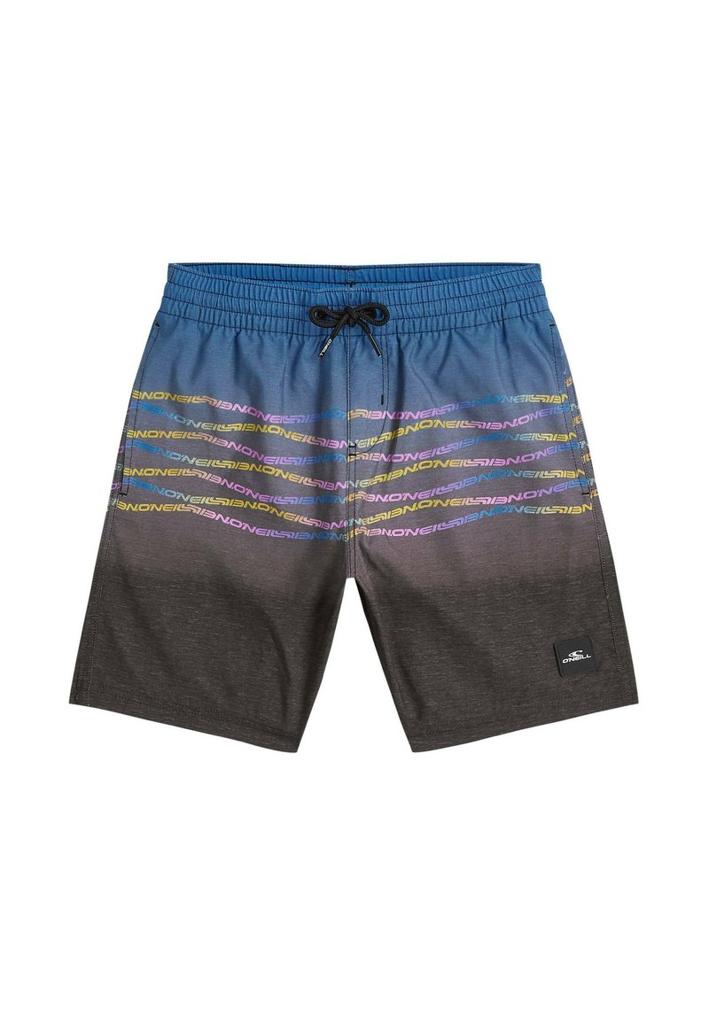 Moške kopalne hlače z modrim do temno sivim gradientom, večbarvnim vodoravnim vzorcem logotipa, črnim pasom z vrvico in stranskimi žepi.