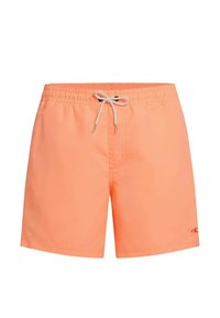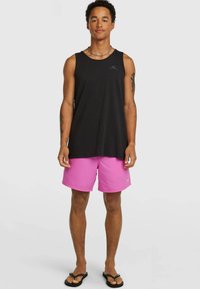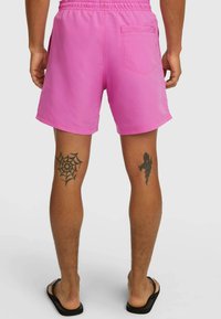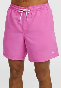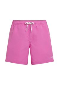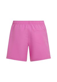 Rožnate kopalne hlače iz lahkega blaga. Imajo elastičen pas z vrvico za zavezovanje in stranske žepe. Gladek tekstura, dolžina nad koleni.