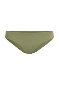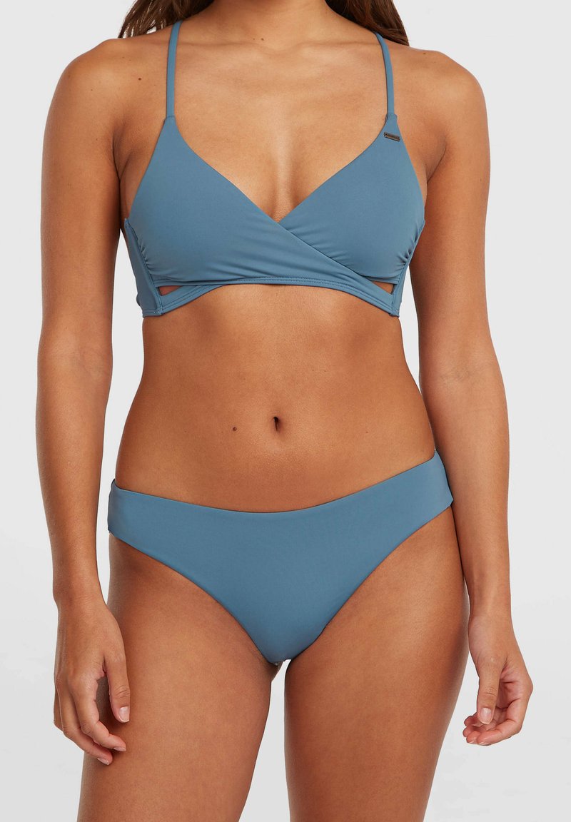 Modri bikini komplet z zgornjim delom v stilu zavijanja z ozkimi naramnicami in izrezanimi detajli, kombiniran z nizkimi, brezšivnimi hlačkami. Gladek teksturen material.