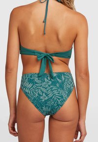Komplet bikinija v turkizni barvi z zgornjim delom v obliki trikotnika z naborki in spodnjim delom z visokim pasom ter cvetličnim vzorcem v svetlejših tonih.