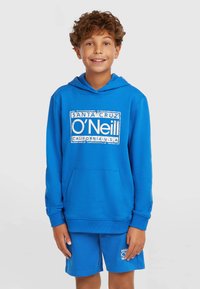Modra jopa s kapuco in žepom za roke ter belim logotipom O'Neill, v kombinaciji z usklajenimi modrimi kratkimi hlačami. Črni natikači zaključujejo opravo.