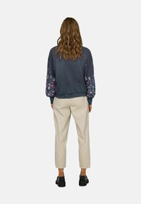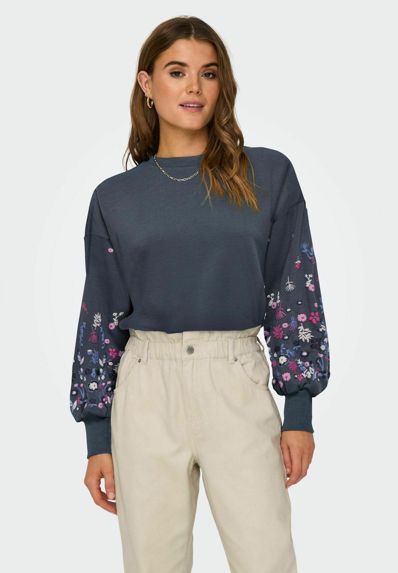 Temno siva sweatshirt z rožnim vezenjem v roza, vijolični in beli barvi na napihnjenih rokavih; v kombinaciji z visokotlačnimi bež hlačami.