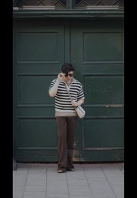 • Črna in bela črtasta kratkohlačna pletena polo majica, rjave široke hlače, siva torba za ramo, črna son�čna očala, stoji pred zelenimi vrati.