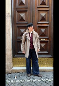 • Mladi moški v bež plašču, črtasti srajci, širokih kavbojkah in črni kapici se naslanja ob velika okrašena lesena vrata z bakrenimi detajli.