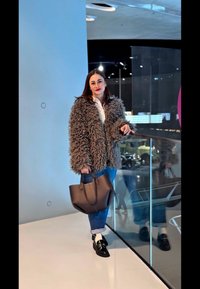 • Plašč iz umetnega krzna v sivi barvi z puhastim teksturo, nošen čez belo srajco in modre kavbojke. Temna torbica dopolnjuje oblačilo.