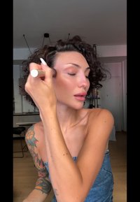 • Ženska s kodrastimi lasmi, tetovažami na desni roki, oblečena v brezramen jeans kombinezon in črne čevlje, sedi na robniku ob sivi steni.