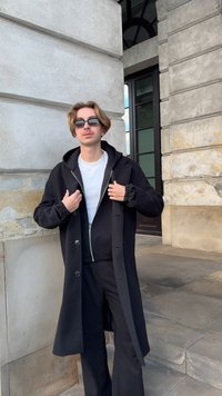 • Črn volnen plašč z zadrgo na ovratniku, oblečen čez belo srajco. Črne pravokotne sončna očala in ozadje iz teksturirane kamnite stene.