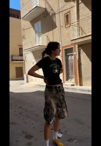 • Črn kratki top z zelenim grafičnim napisem in nečim zvezda v obliki ogrlice. Kamuflažne cargo kratke hlače z žepi. Asfaltirana ulica in stavbe v ozadju.