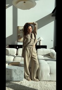 • Svetlo bež komplet za prosti čas, izdelan iz mehkega materiala z udobnim krojem. Učinkovite ovinkaste šive in visoko ovratnico. Sedi na teksturirani svetli sedežni garnituri.