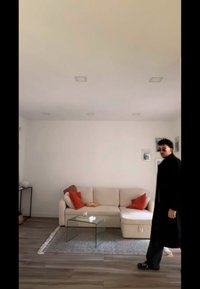 • Moški z sončnimi očali, dolgim črnim plaščem in jeans jakno stoji v dnevni sobi z bež kavčem in rdečimi blazinami.