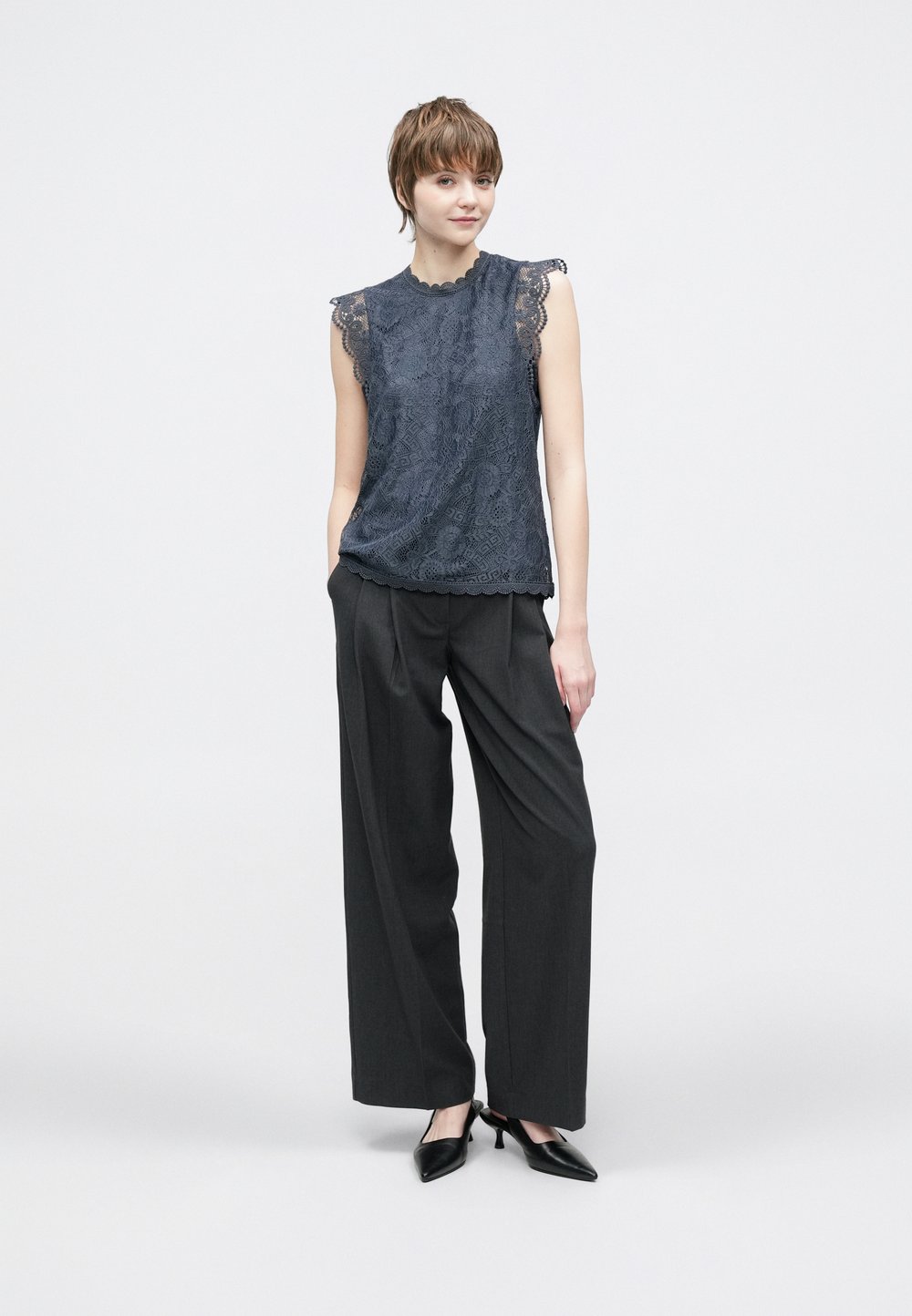 Svetlo siva, jakna s pasom in gumbi, v kombinaciji s širokimi črnimi hlačami. Burgundska usnjena torbica in usklajeni škornji s koničastim nosom.