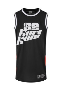 Črni košarkarski dres z napisom "Los Angeles", črne kratke hlače, črno-beli športni copati, plastični nakit in kapučinsko jakno z rdečimi akcenti.