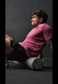 • Črne športne kratke hlače z logotipom "HYROX", v kombinaciji z belimi športnimi copati in prilagojeno maroon majico. Vidna tetovaža na roki.