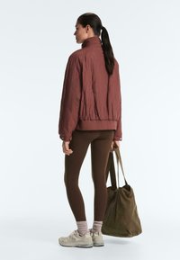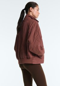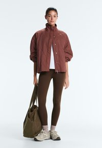 Ženska, ki nosi rjavo prešito jakno z zapenjalnimi gumbi in elastičnimi manšetami, združeno s temno rjavimi hlačami, stoji pred belim ozadjem.