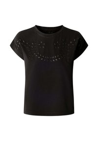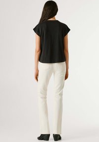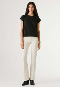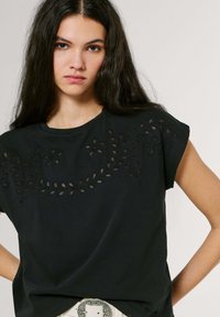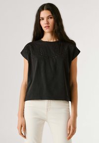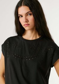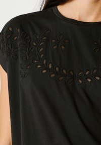 Mlada ženska z dolgimi temnimi lasmi, oblečena v črno vezeno majico s kratkimi rokavi in bele hlače, stoji pred enobarvnim ozadjem.