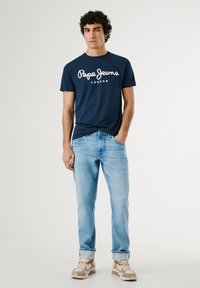 Mladenič z valovitimi lasmi, oblečen v temnomodro majico s potiskom "Pepe Jeans London" in svetlo modre kavbojke, stoji pred enobarvnim svetlim ozadjem.
