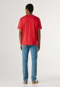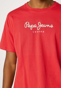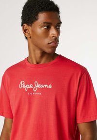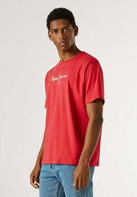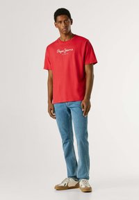 Rdeča bombažna majica z okrolim izrezom, kratkimi rokavi in belim napisom "Pepe Jeans London" čez prsni koš, kombinirana z modrimi kavbojkami.