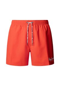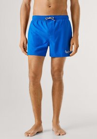 Moški, ki nosi svetlo modre kopalne hlače z vrvico in logotipom "Pepe Jeans" na levi nogi, stoji bos ob preprostem ozadju.