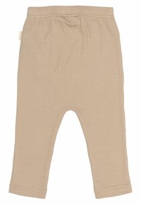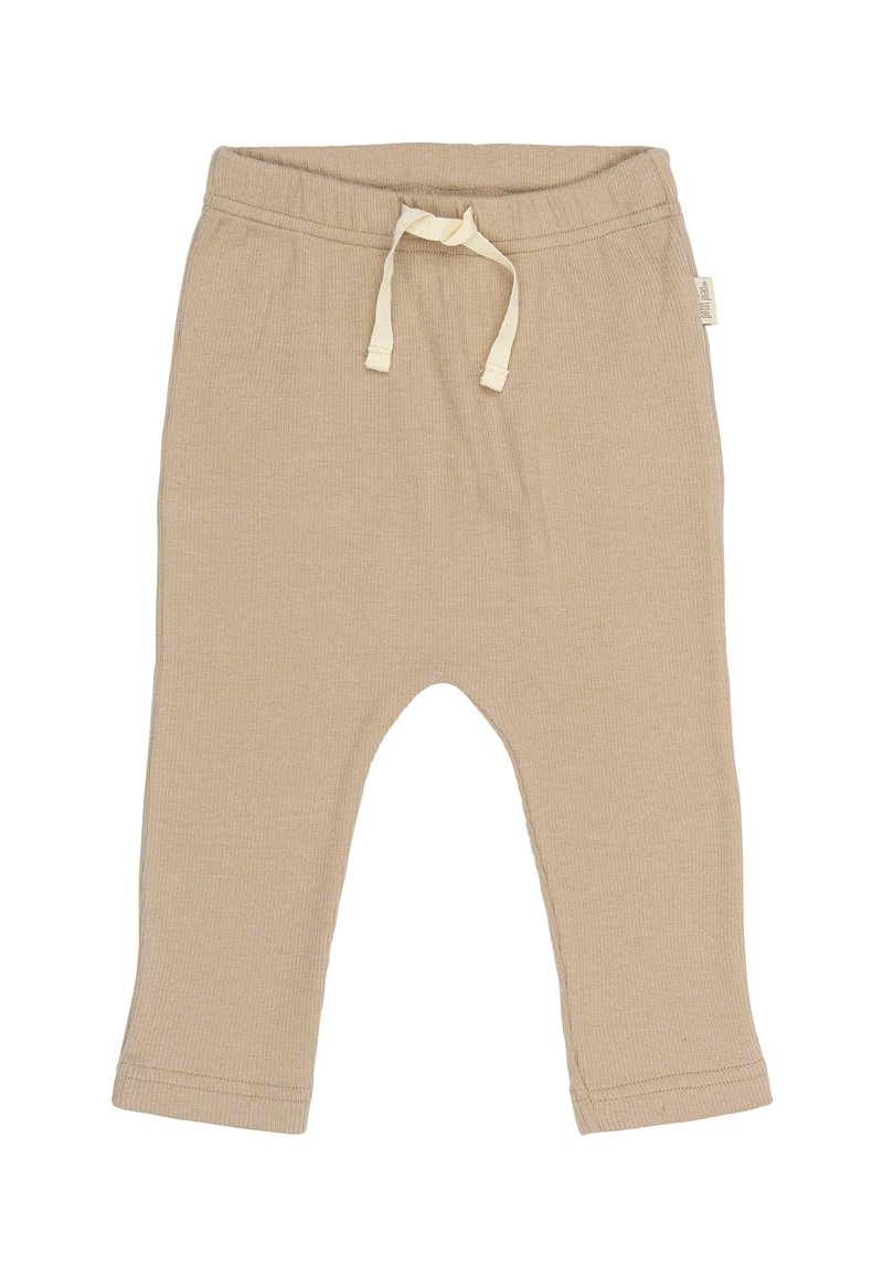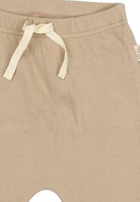 Bež hlače iz bombaža z rebrasto teksturo, elastičnim pasom in vrvico. Imajo zožene noge in prišite robove.