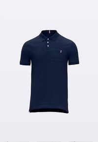 Bela polo majica s kratkimi rokavi in žepom, v kombinaciji z modrimi ozkimi hlačami in belimi supergami. Enostaven dizajn, brez vzorcev ali dodatkov.