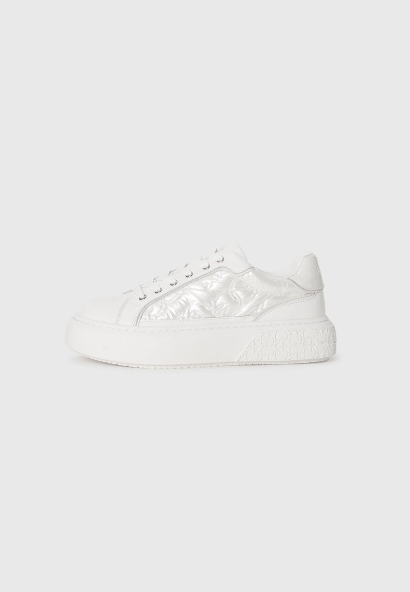Beli platformni supergi z oblazinjenimi stranskimi paneli, spredaj z vezalkami in vzorčastim podplatom, prikazani v desnem stranskem profilu na svetlem ozadju.