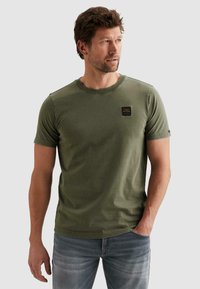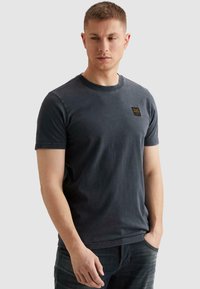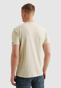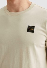 Mlad moški, oblečen v bež kratko majico s črno logotipno značko, ki pozira z eno roko v žepu in gleda levo.