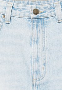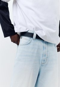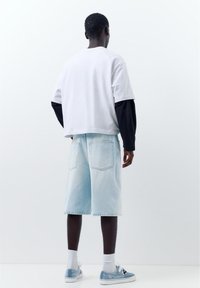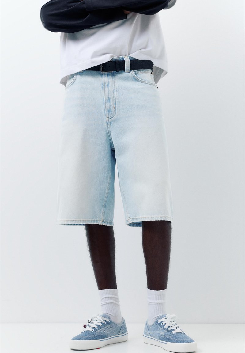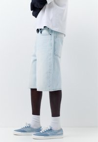 Moški v svetlo modrih denim kratkih hlačah, belih nogavicah, svetlo modrih supergah in črnem pasu, stoji z rokami prekrižanimi.